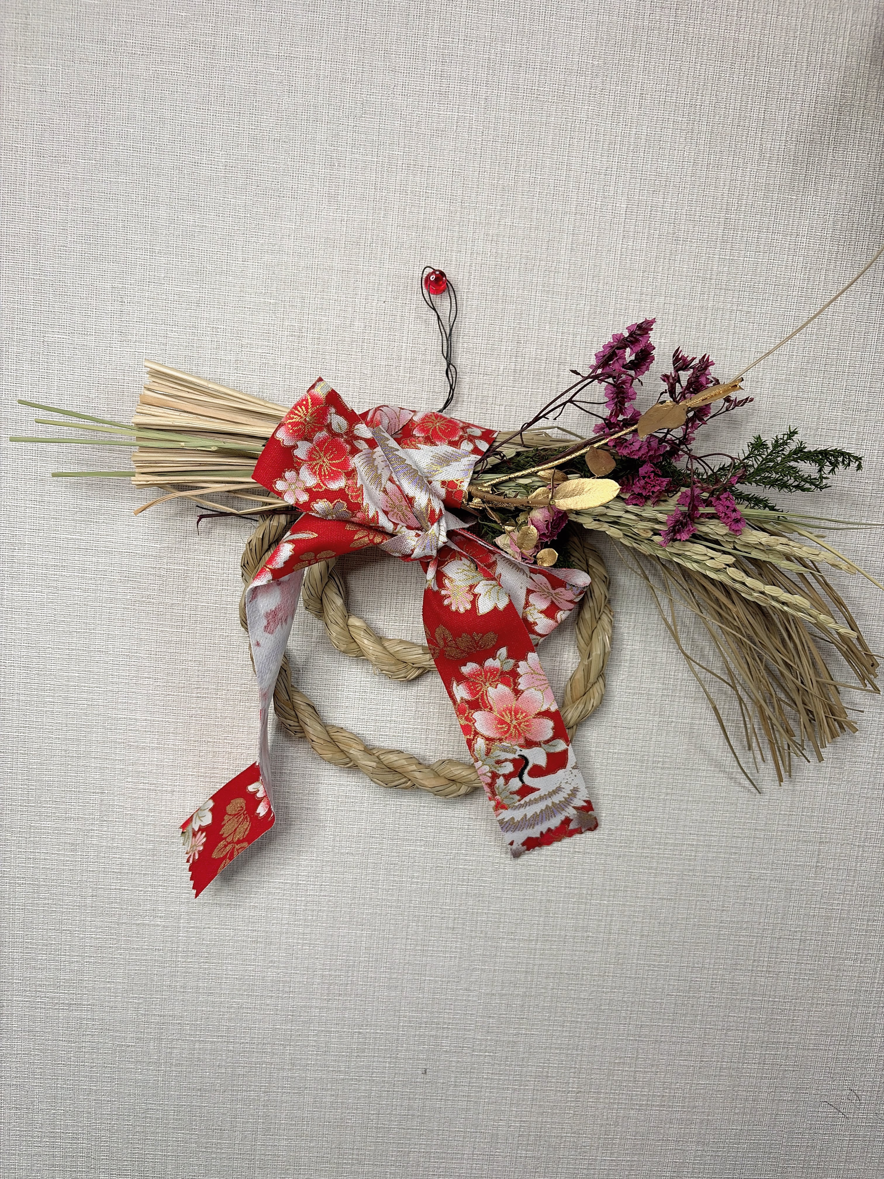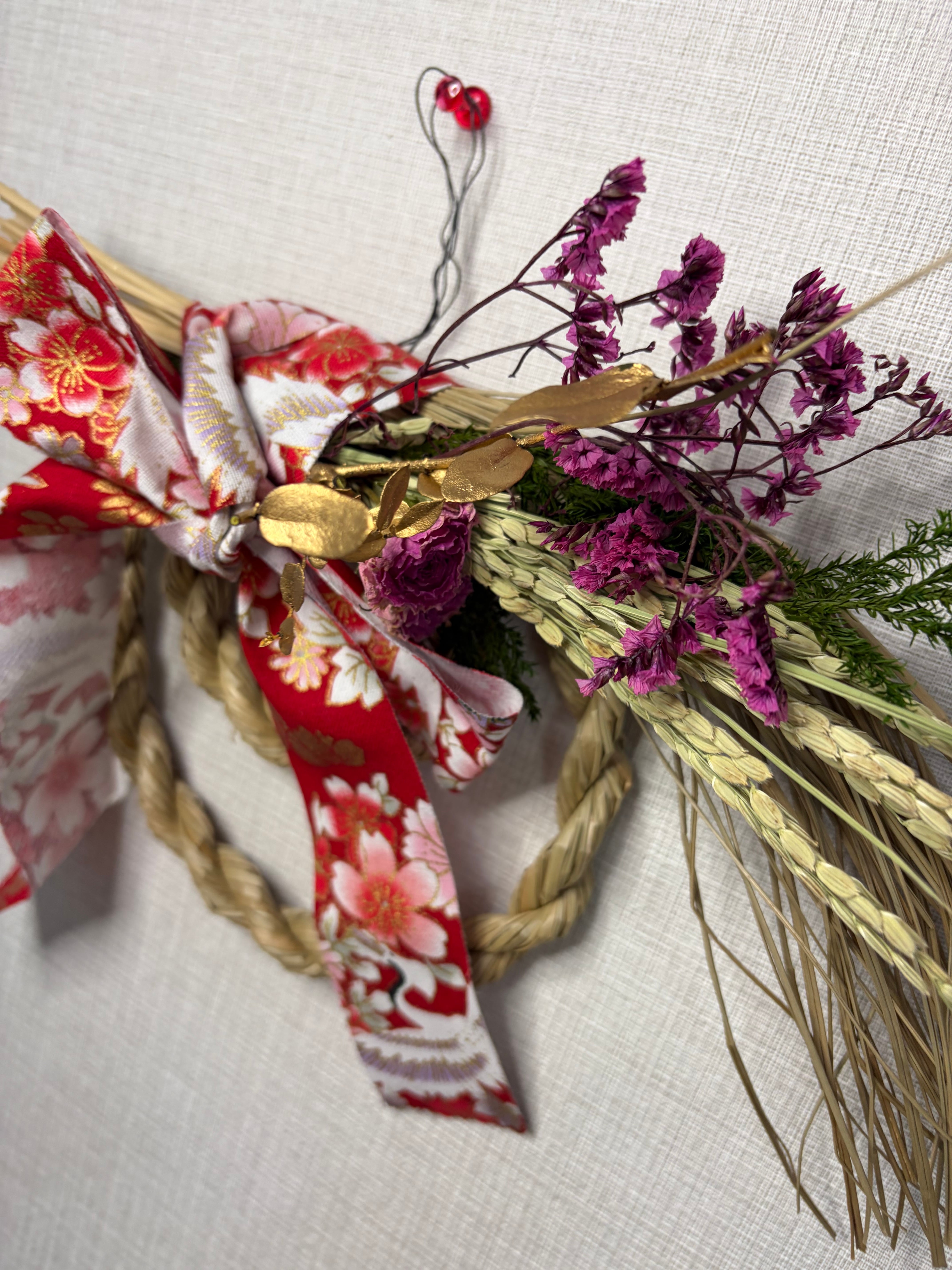 ピンク系色のドライフラワーと稲穂を付けて お正月らしいリボンをつけてみました。