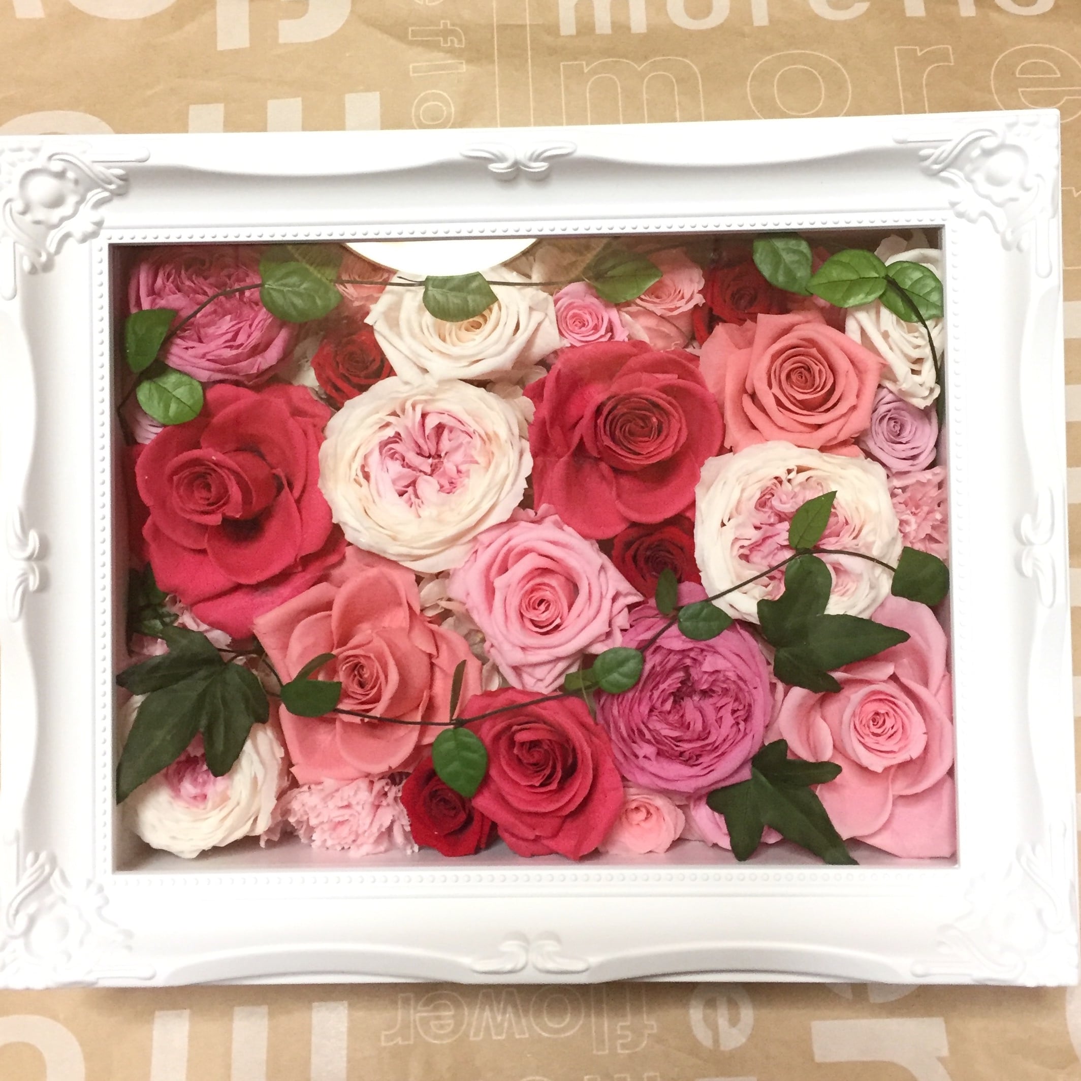 白のフレームに入ったプリザーブドフラワーです。縦置き、横置き、壁掛けとしても飾っていただけます。